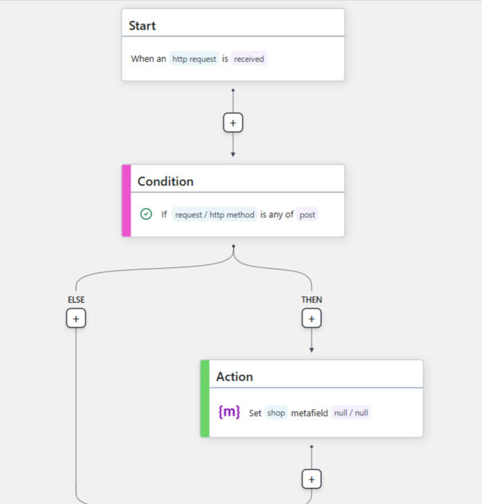 This condition will ensure your actions are only run for a specific request method. You can have a single workflow that contains multiple condition groups that check for various request methods, so a single workflow could perform different actions when receiving a POST, PUT, or DELETE request.