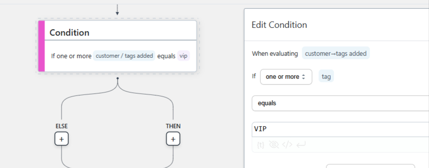 For example, if you wanted to automatically send an email or enroll the customer in a loyalty program when the "VIP" tag is added, select the Customer->Tag Added condition.