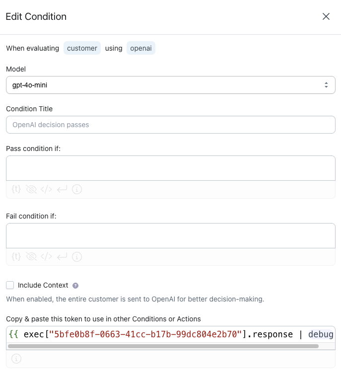 Choose the AI model you'd like to use and describe your pass and fail criteria. If you need the response in later steps, copy the Exec token.