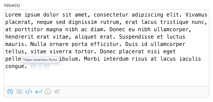 When you click Insert token, Arigato displays a token insertion point placeholder in blue text that shows the point at which the token will be inserted. The token insertion point can be moved vertically or horizontally in the text area.
